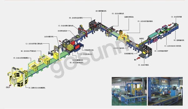 工藝流程:自動開箱--自動分道整理-自動裝箱--自動封箱